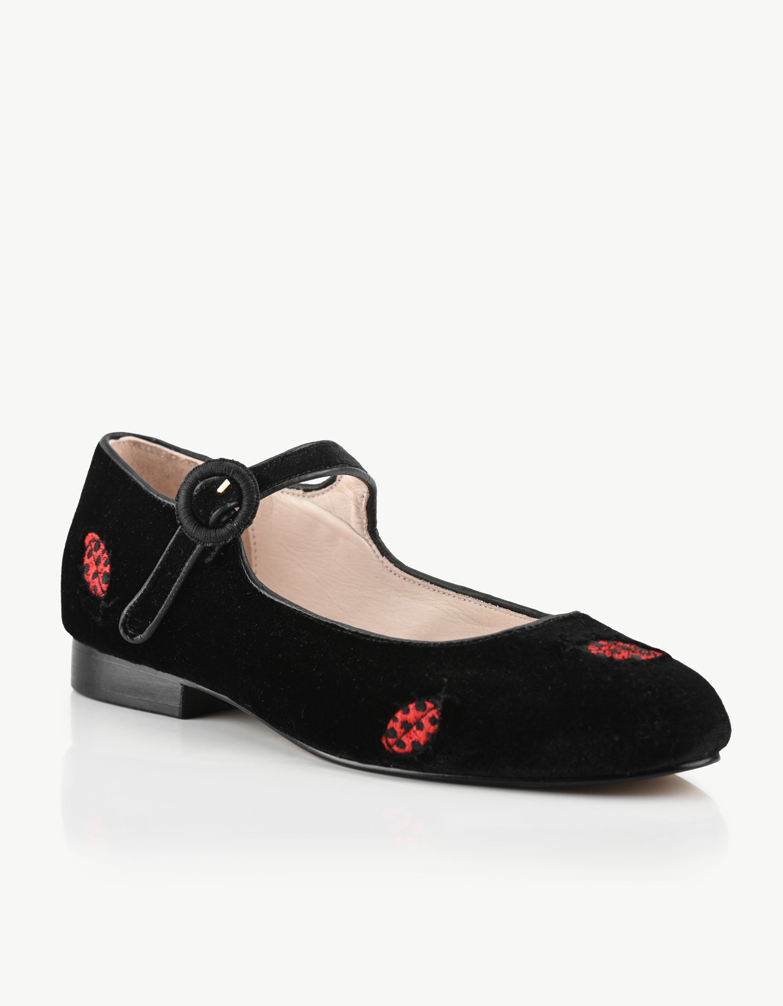 Loafer en piel bovina y terciopelo negro con bordados de Mariquitas.