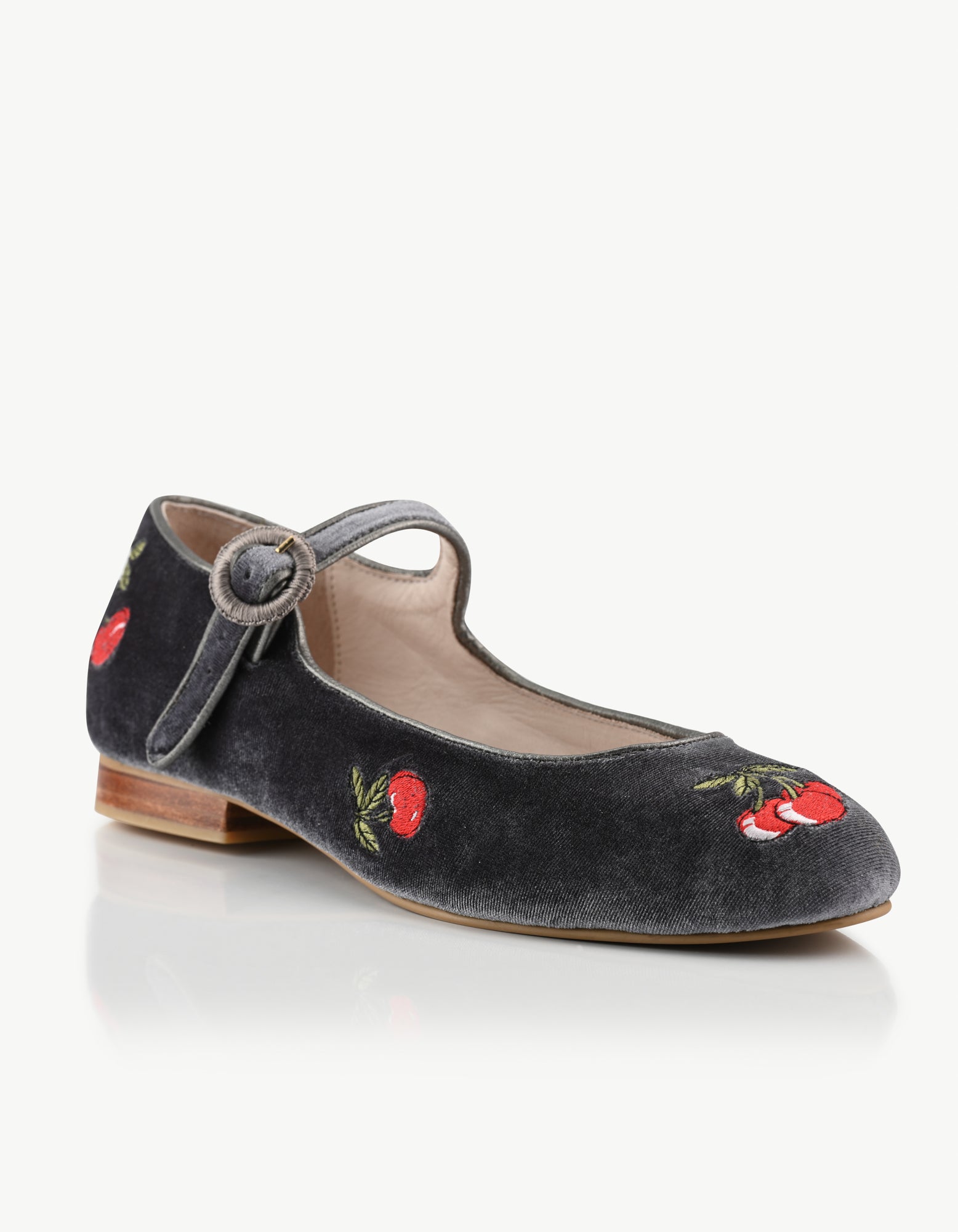 Loafer en piel bovina y terciopelo gris con bordados de Cerezas.