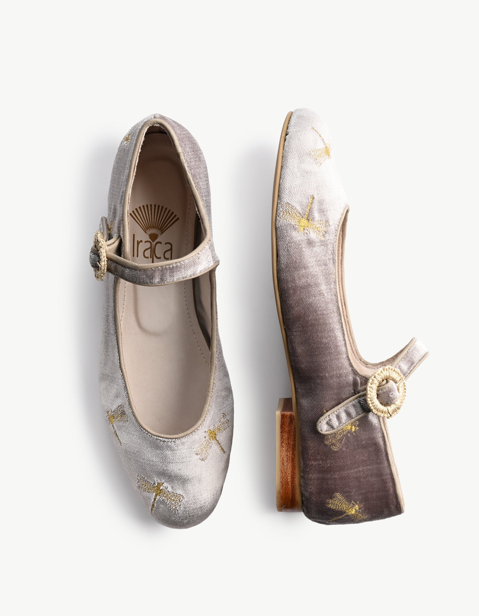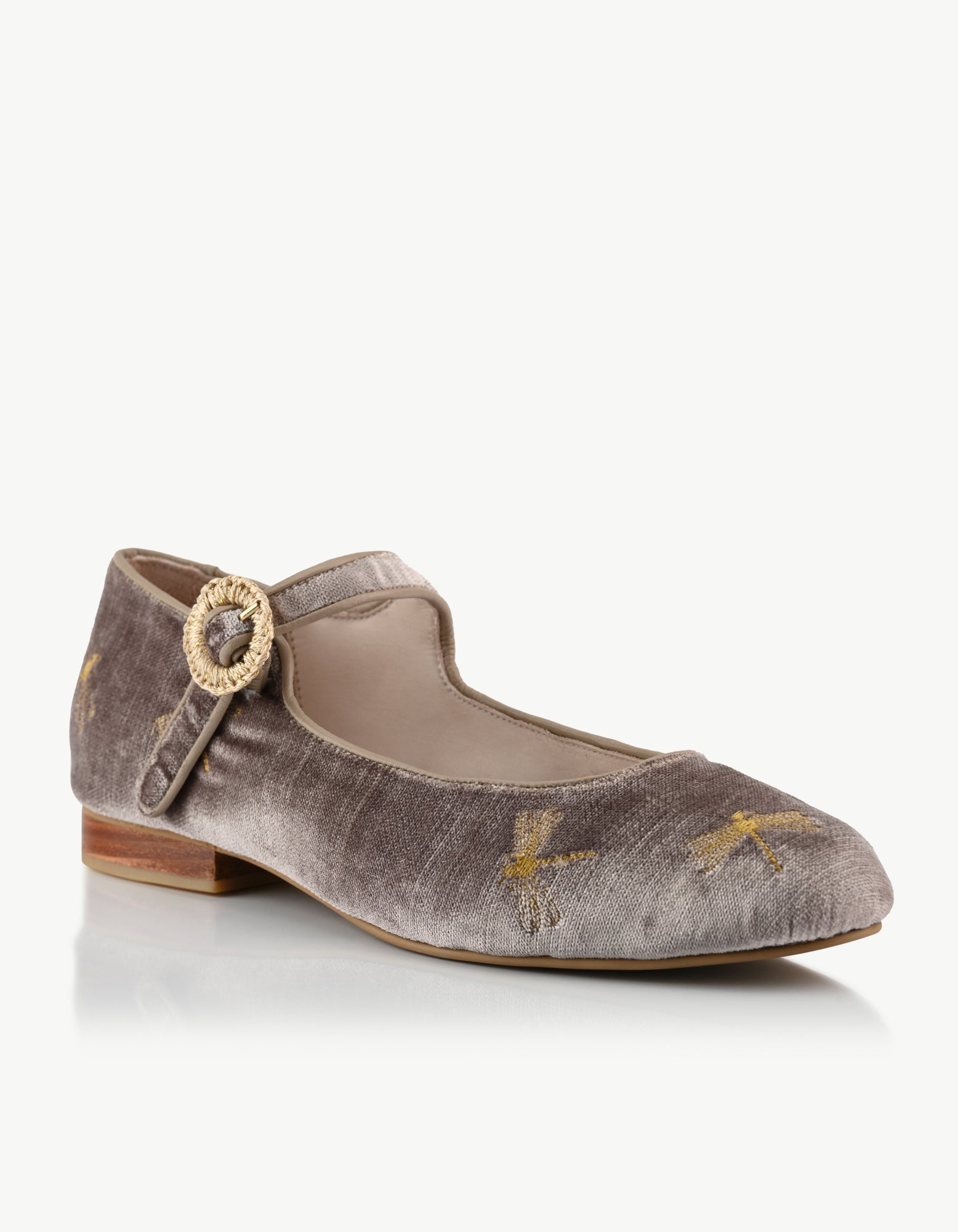 Loafer en piel bovina y terciopelo taupe con bordados de Libelulas.