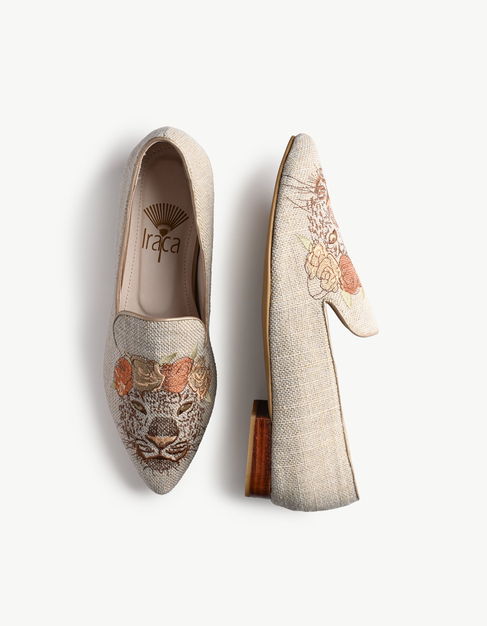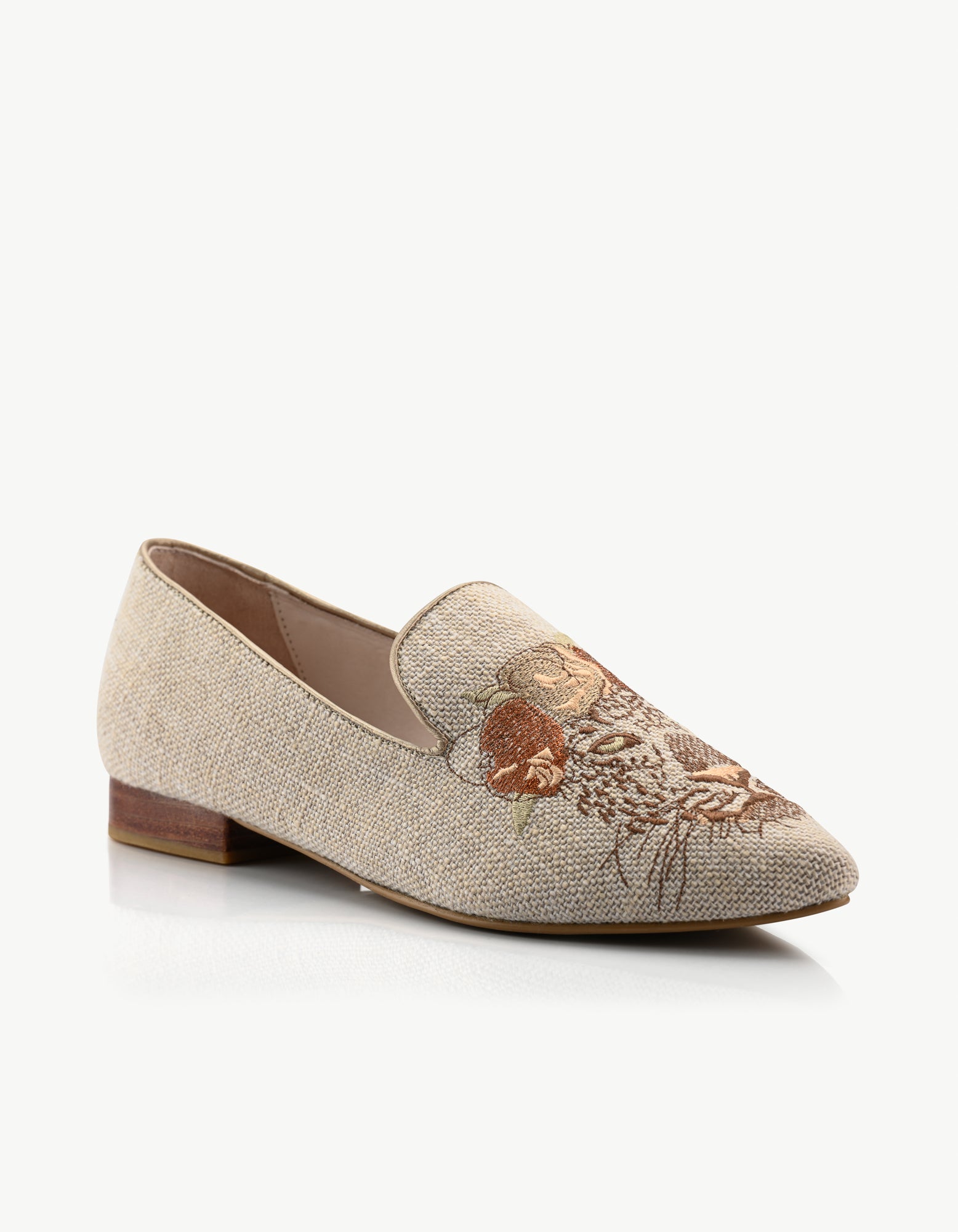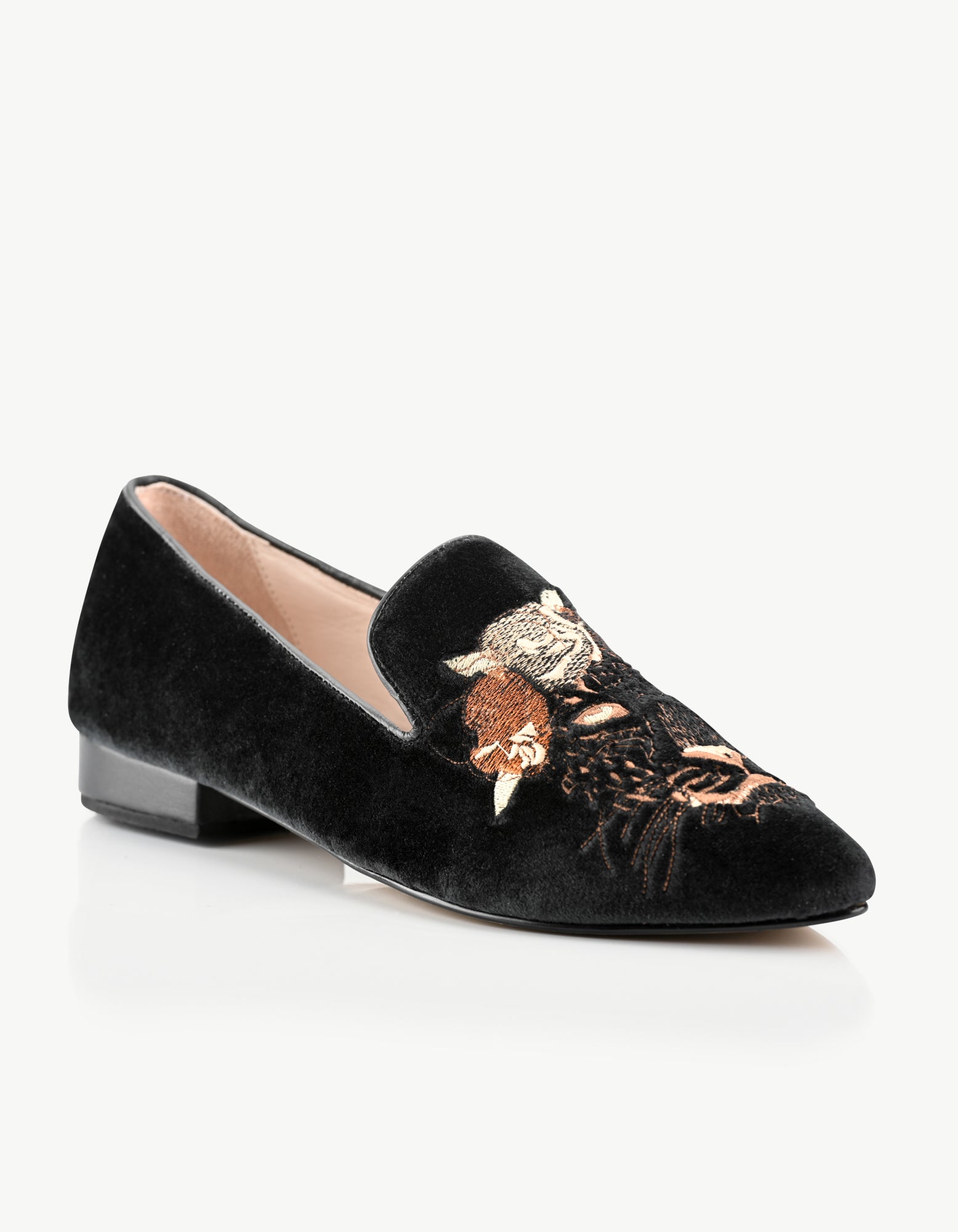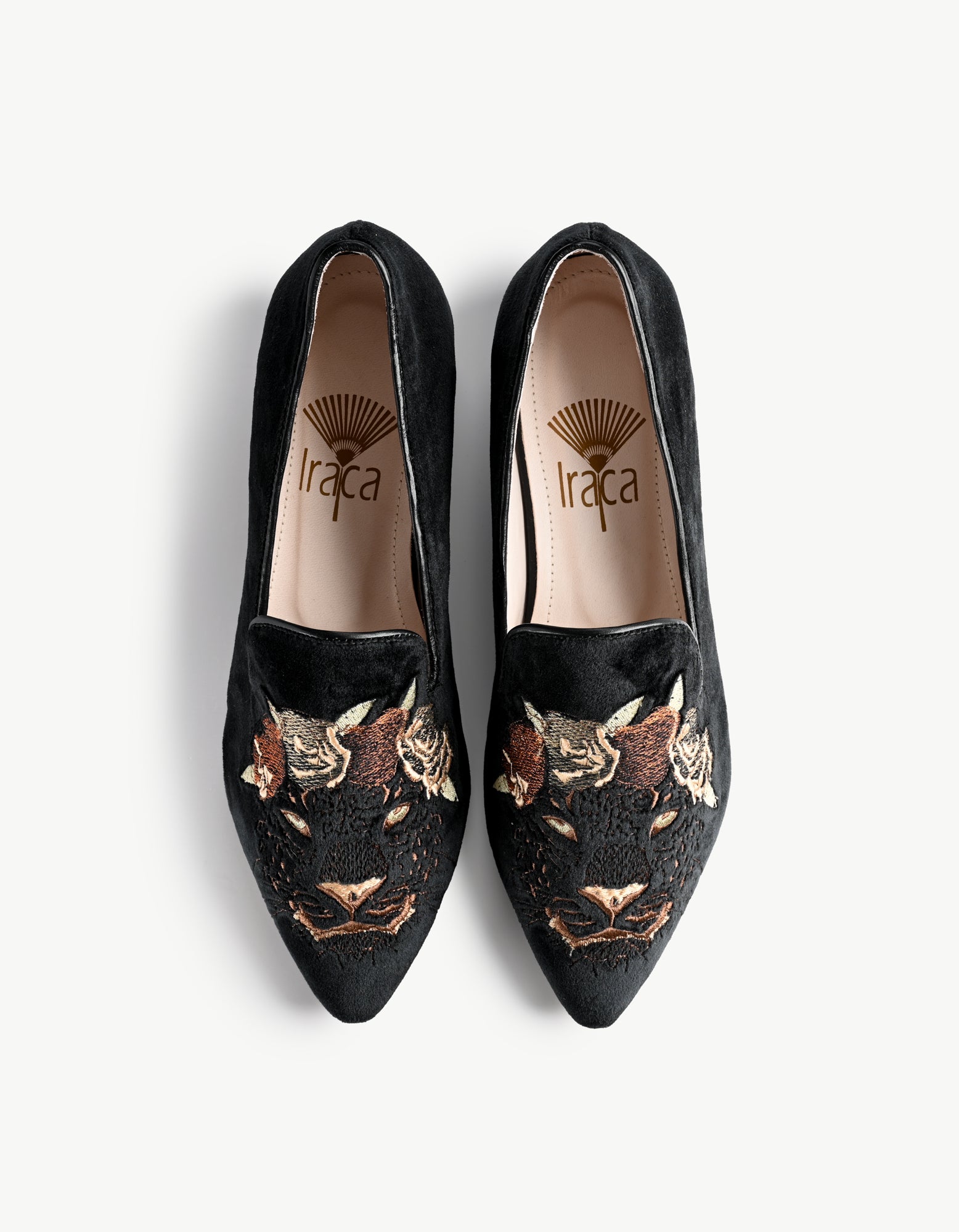 Loafer en terciopelo negro y lino arena, bordado, con interior en piel.